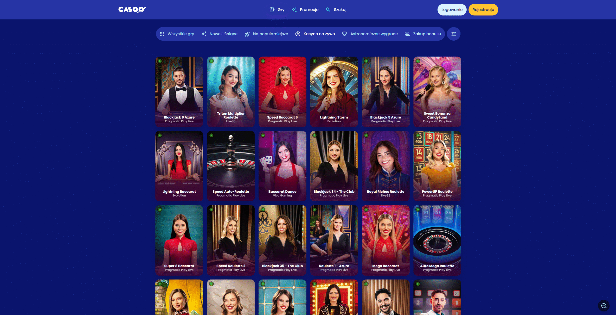 Dostępne kategorie to: automaty (slots), gry stołowe (ruletka, blackjack, baccarat) oraz Live Casino z prawdziwymi krupierami.