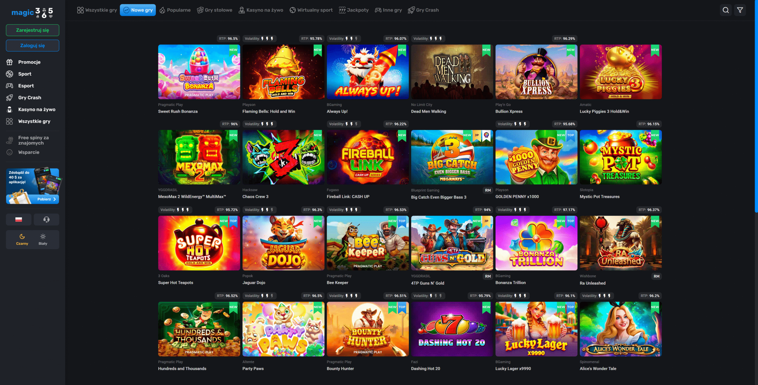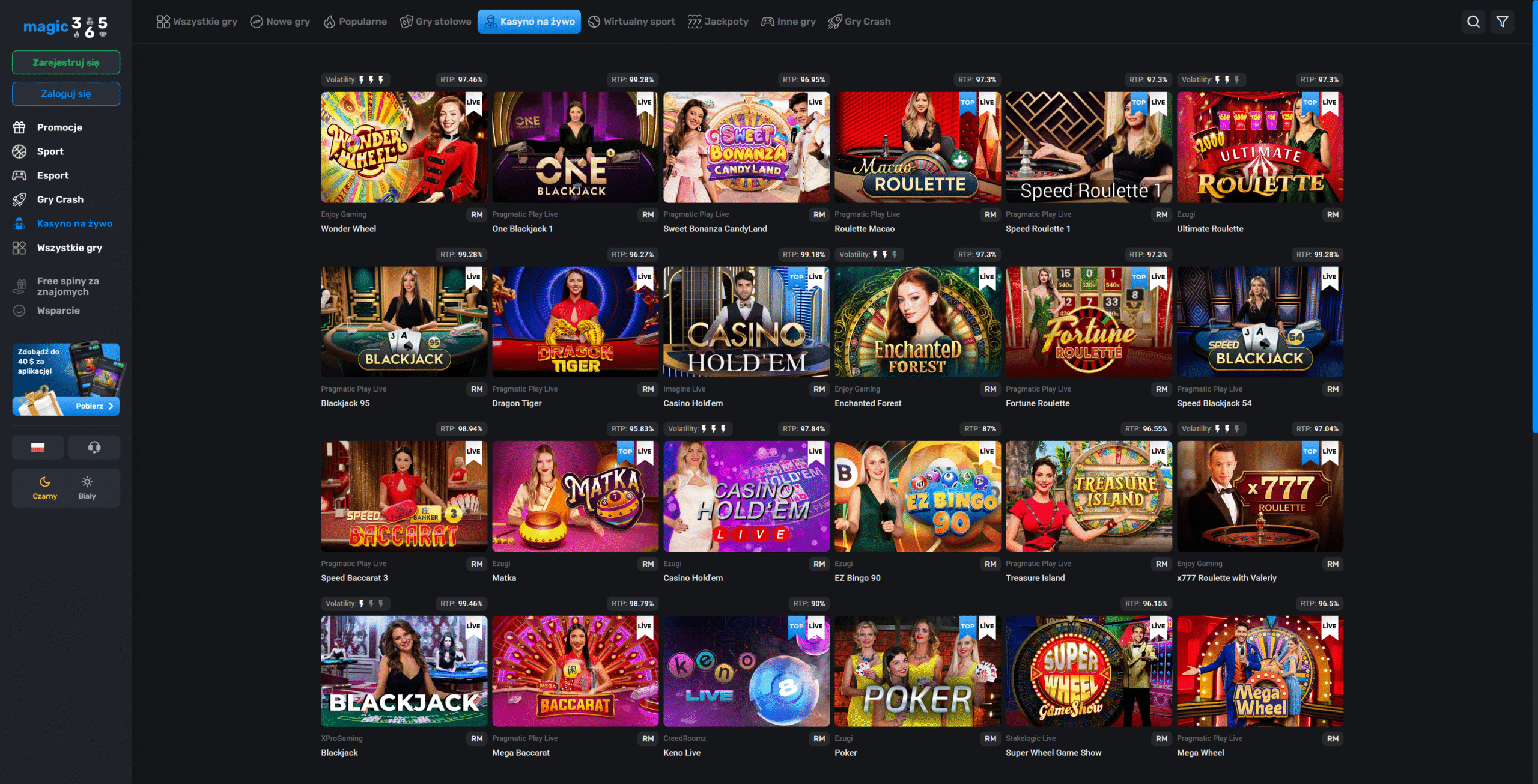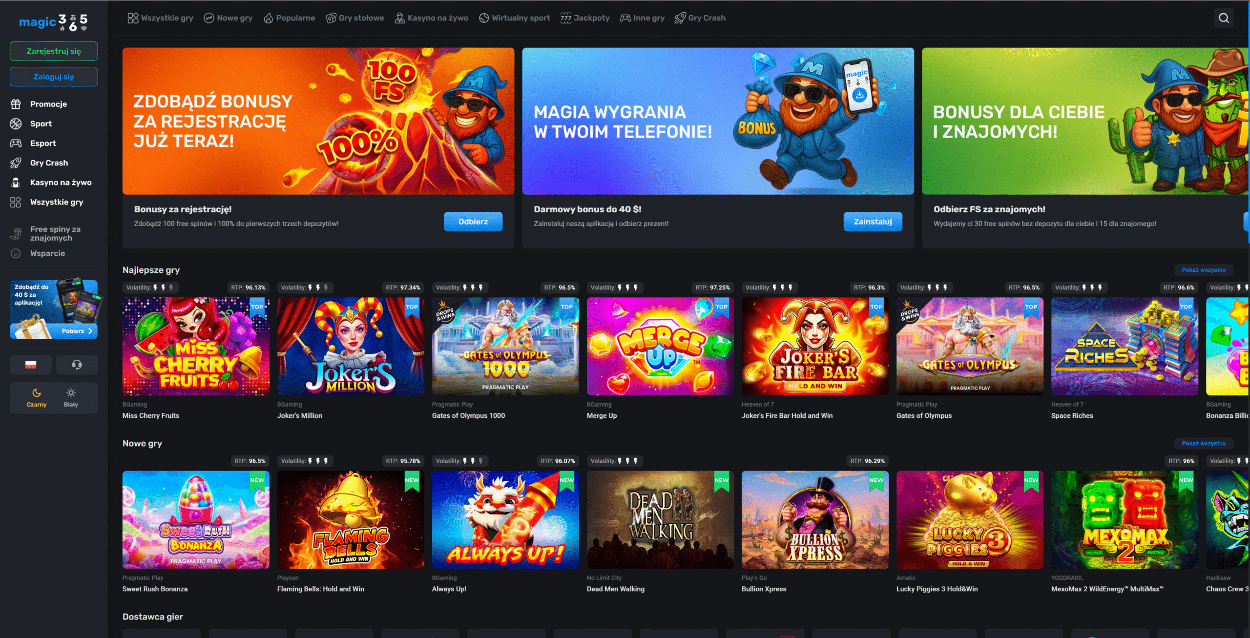 Magic365 Casino to nowoczesna platforma hazardowa online, która wyróżnia się klimatycznym, „magiczno–fantasy” designem i szeroką ofertą gier dla graczy z Polski. Znajdziesz tu zarówno klasyczne sloty, jak i nowoczesne automaty wideo z motywami przygodowymi, ruletkę, blackjacka, pokera oraz gry na żywo z krupierami.