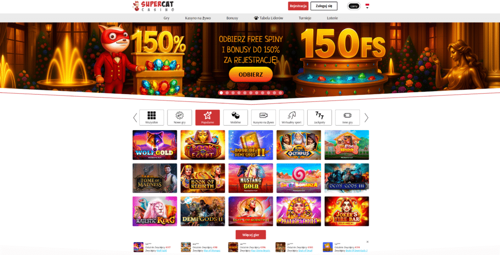SuperCat Casino to dynamiczna platforma online, która przyciąga graczy nie tylko oryginalnym „kocim” brandingiem, ale też szeroką ofertą gier hazardowych. Kasyno działa legalnie i obsługuje graczy z wielu krajów, w tym z Polski, zapewniając dostęp do setek automatów, gier stolikowych oraz rozgrywek na żywo z krupierami.
